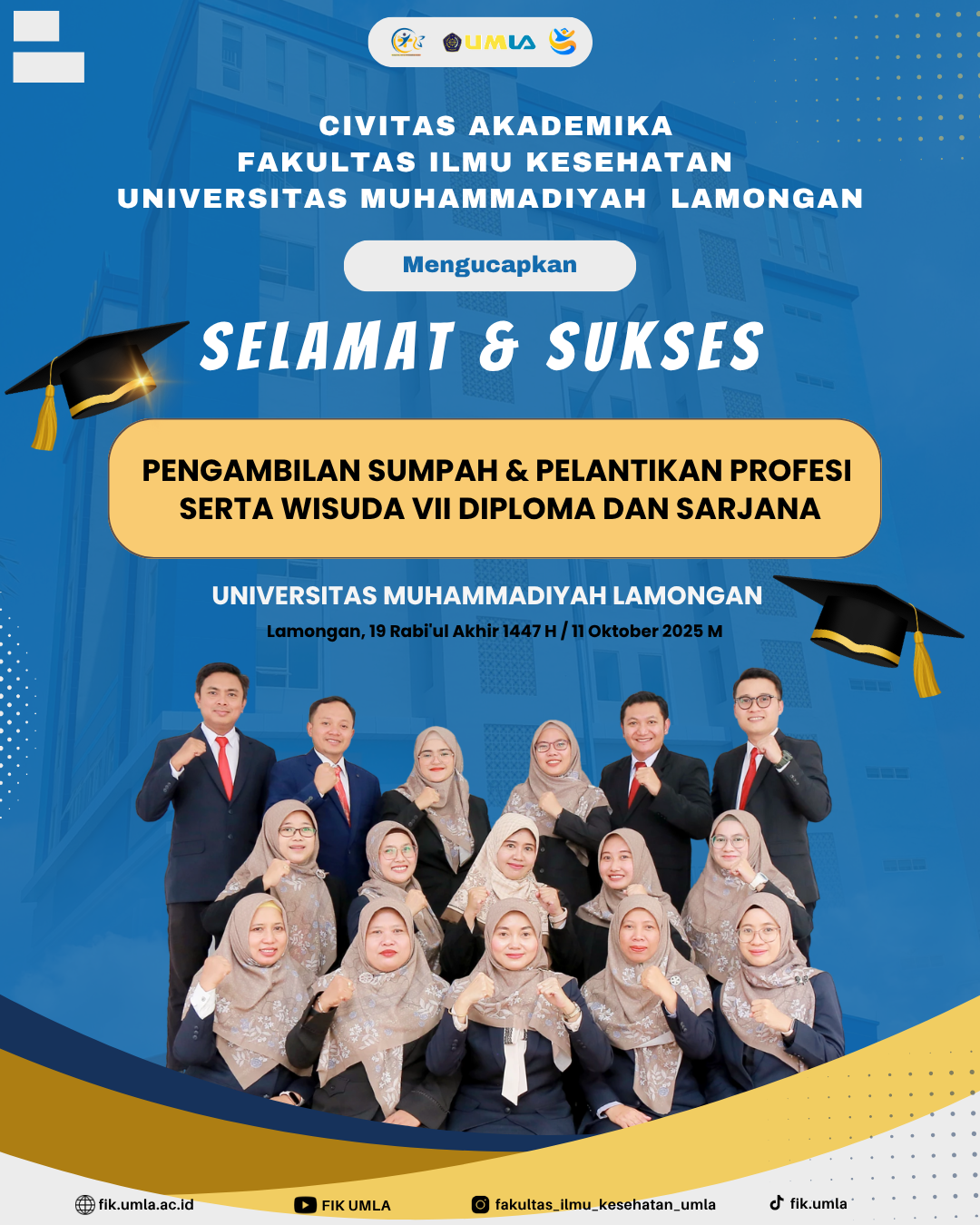 CIVITAS AKADEMIKA FAKULTAS ILMU KESEHATAN UNIVERSITAS MUHAMMADIYAH LAMONGAN MENGUCAPKAN SELAMAT DAN SUKSES PENGAMBILAN SUMPAH DAN PELANTIAN PROFESI SERTA WISUDA KE VII UNIVERSITAS MUHAMMADIYAH LAMONGAN. Kegiatan ini dilaksanakan pada hari Sabtu tanggal 11 Oktober 2025 di DOME UMLA.